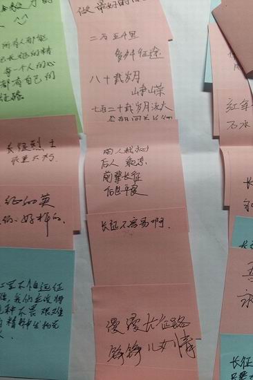 在现场活动中,虽然天飘细雨,暮色渐浓,帐篷边依然站着坚守的干事们,来往的同学们也愿意在雨中驻足,为长征先烈送上追思,写下自己对于长征的感想。有的同学道出了对长征的看法:“长征是一场革命信念与恶劣环境的较量。”也有的同学很朴实的写道:“长征真的不容易啊!”