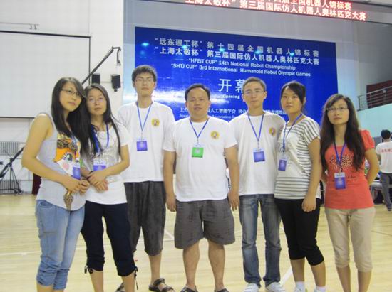 2012年7月24日-7月29日,“远东理工杯”第十四届全国机器人锦标赛暨“上海太敬杯”第三届国际仿人机器人奥林匹克大赛在冰城哈尔滨远东理工学院隆重举行。来自北京大学、哈尔滨工业大学、南京大学、华中科技大学、圣彼得堡科技大学、东国大学等中国、美国、加拿大、俄罗斯、韩国及多哥的70多所高校的近800人参加了该项比赛,其中第十四届全国机器人锦标赛是由国内高校参加,第三届国际仿人机器人加入了众多国际比赛队伍。我校8名“引擎”仿人机器人在方宝富副教授的指导和6名参赛队员的精心调试下,参加了双人舞蹈、单人舞蹈、阶梯跑、短跑、翻滚及四人芭蕾舞等6个项目的比赛,获得“远东理工杯”第十四届全国机器人锦标赛单人舞蹈、双人舞蹈二等奖。获得第三届国际仿人机器人奥林匹克大赛四人芭蕾舞蹈季军、机器人翻滚季军及单人舞蹈、双人舞蹈、阶梯跑、短跑二等奖。央视网CNTV和韩国媒体分别对我校队员薛健和陈金金进行了采访。李德毅院士饶有兴趣地观看了我校的四人芭蕾舞,并高度赞赏我校机器人的精彩表演。